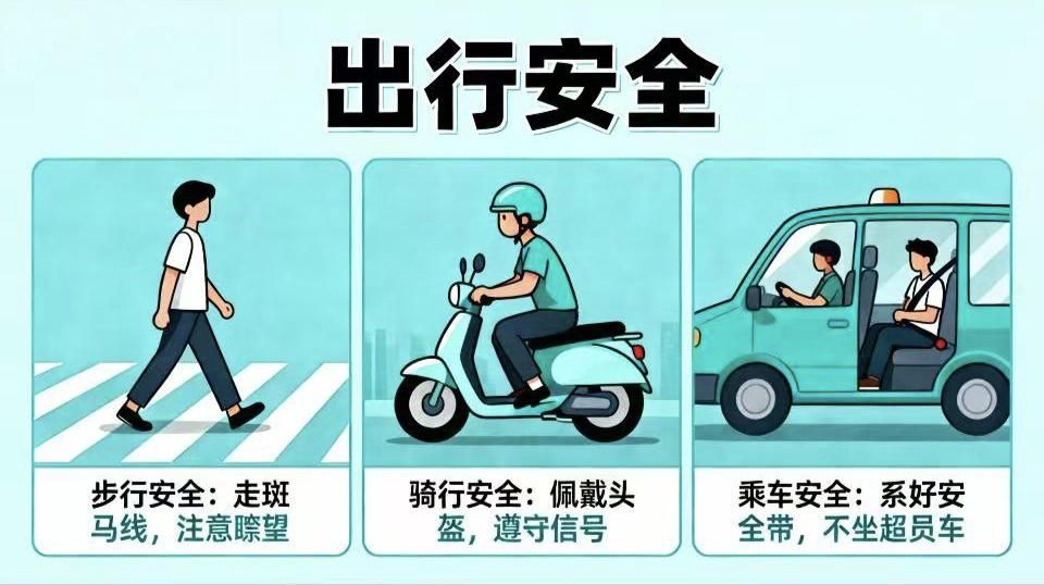 乘坐正规交通工具,遵守交通规则,不乘坐非法营运车辆。自驾出行需检查车况,避免疲劳驾驶。在公共场所保管好随身物品,谨防盗窃。