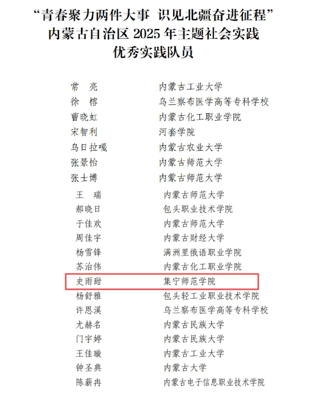 近日,2025年内蒙古自治区大学生 “青春聚力两件大事 识见北疆奋进征程”主题社会实践活动评选结果正式揭晓,我校马克思主义学院史雨甜同学凭借“火炬心光宣讲团”中的出色表现,荣获自治区“优秀实践队员”荣誉称号,充分彰显了我校青年学子坚定的理想信念、过硬的专业素养和强烈的社会责任感。