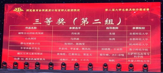 本次大赛自2024年7月12日启动报名以来,组团高校积极组织师生参与,经过校赛、初赛两轮评审,从469个作品中推荐64个作品参加复赛。其中我校对123项自制教具进行评选,学校选出30项代表我校参加初赛,我院推选的24项作品中13项成功入选初赛,经过专家评选我校有10项作品入选复赛,其中我院有7项入围复赛。在复赛中通过现场展示和答辩的方式,向评委和观众展示了他们的教具作品。评委们从创新性、实用性、有效性、耐用性、便捷性和安全性等多个方面对参赛作品进行了综合评审,经过激烈角逐,我院作品被评选出特等奖1项、二等奖1项、三等奖2项、优秀奖3项。