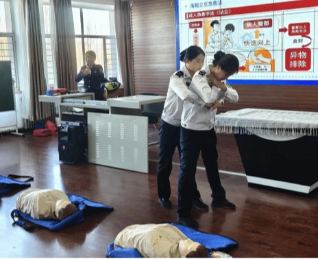在培训现场,急救工作人员通过视频展示,让大家深入了解其日常工作并体会到急救工作的紧迫性与重要性。随后,专业人员详细讲解心肺复苏术,重点强调按压姿势、频率及位置等关键要点,并细致介绍自动体外除颤器(AED)的使用方法。急救技能讲解环节中,张惠名生动演示海姆立克急救法,对不同情况的急救手法进行详尽说明;魏佳茜围绕正确拨打120展开讲解,着重强调信息准确传达的重要性,提醒大家保持冷静、准确描述现场情况。