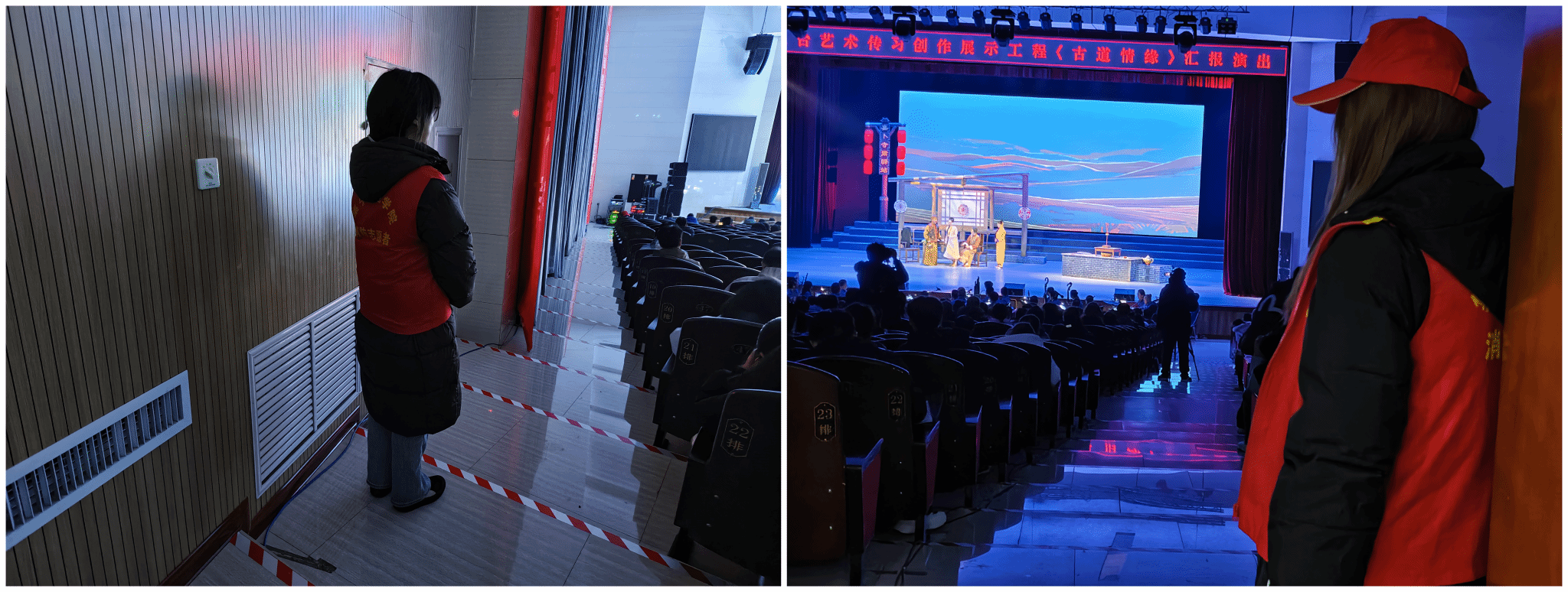 演出开始之前,志愿者们提前到达现场,对报告厅的消防设施、应急通道等展开全面排查,核查灭火器压力、疏散标识的清晰程度,并完成舞台区域的安全隐患巡查工作。此外,志愿者们预先熟悉场地布局,明确人员值守位置与应急处置流程,为演出的顺利进行做好准备。