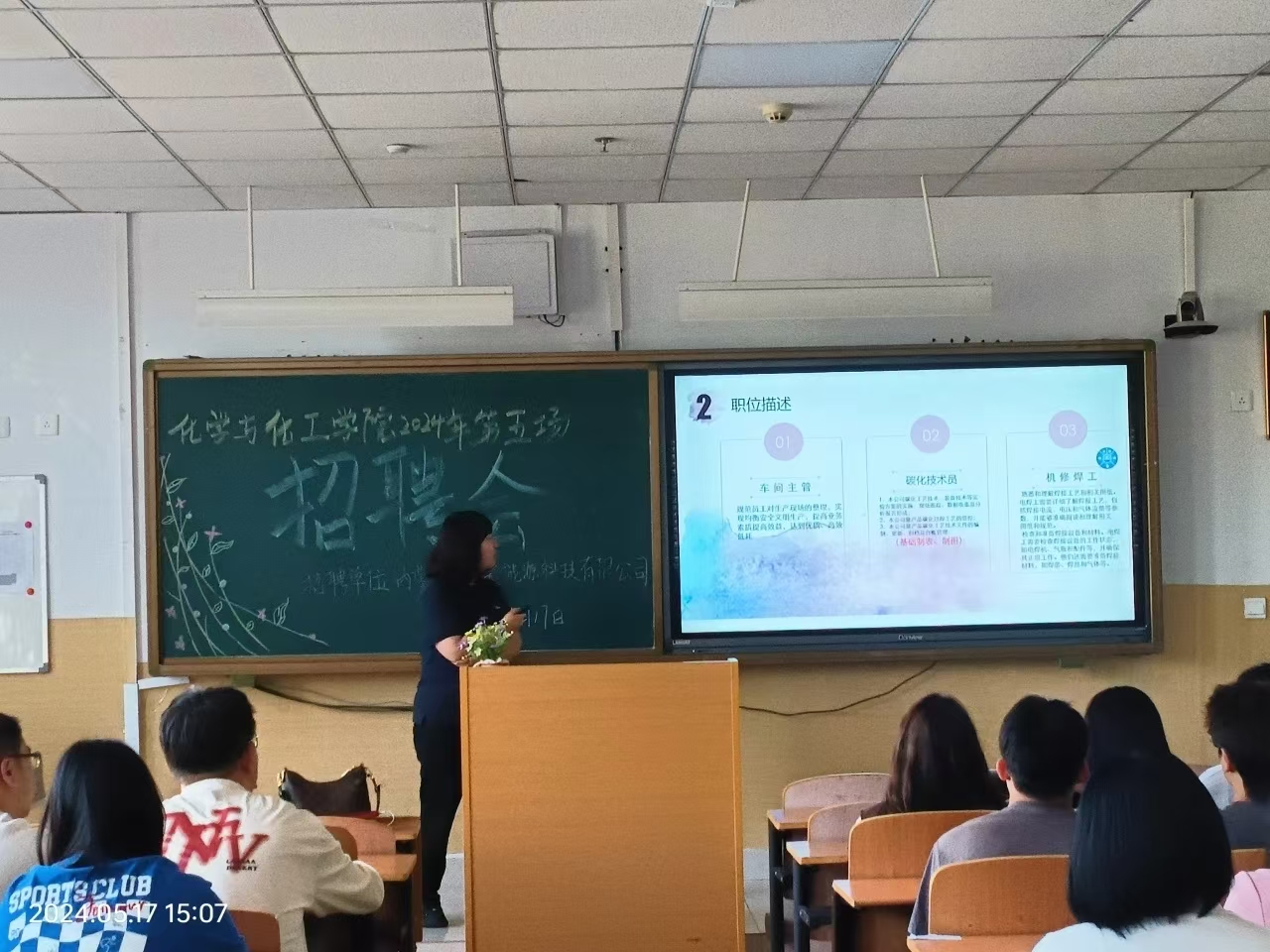 2024年5月17日下午3点,化学与化工学院在逸夫楼102举办2024年第五场招聘会。此次内蒙古凯金新能源科技有限公司来我院招兵买马。学院党总支副书记李强出席活动。