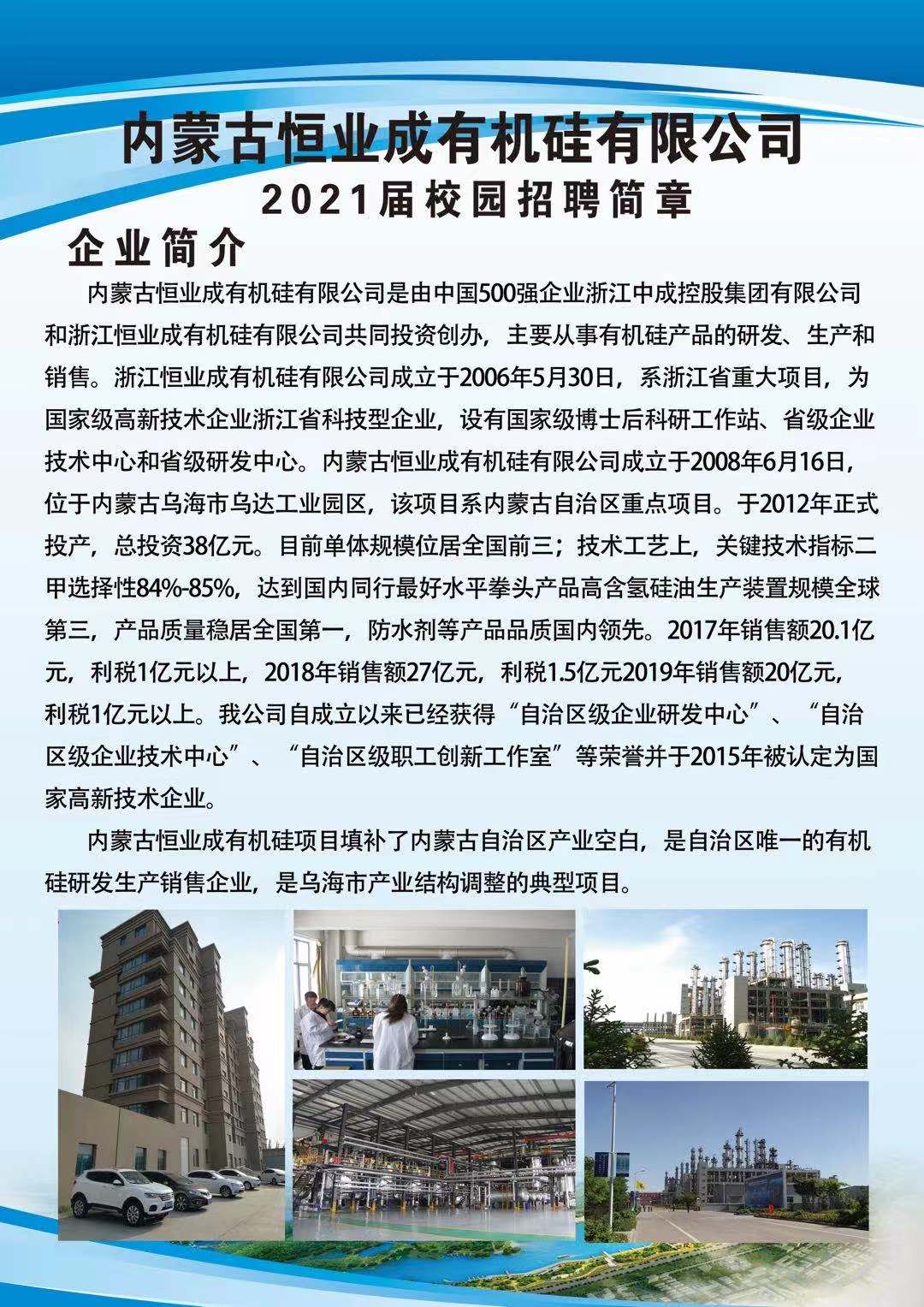 内蒙古恒业成有机硅有限公司是由中国500强企业浙江中成控股集团有限公司和浙江恒业成有机硅有限公司共同投资创办,主要从事有机硅产品的研发、生产和销售。浙江恒业成有机硅有限公司成立于2006年5月30日,系浙江省重大项目,为国家级高新技术企业、浙江省科技型企业,设有国家级博士后科研工作站、省级企业技术中心和省级研发中心。内蒙古恒业成有机硅有限公司成立于2008年6月16日,位于内蒙古乌海市乌达工业园区,该项目系内蒙古自治区重点项目。于2012年正式投产,总投资38亿元。目前单体规模位居全国前三;技术工艺上,关键技术指标二甲选择性84%-85%,达到国内同行最好水平;拳头产品高含氢硅油生产装置规模全球第三,产品质量稳居全国第一,防水剂等产品品质国内领先。2017年销售额20.1亿元,利税1亿元以上,2018年销售额27亿元,利税1.5亿元。2019年销售额20亿元。我公司自成立以来已经获得“自治区级企业研发中心”、“自治区级企业技术中心”、“自治区级职工创新工作室”等荣誉并于2015年被认定为国家高新技术企业。