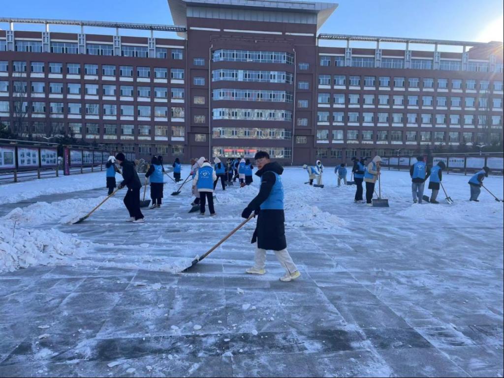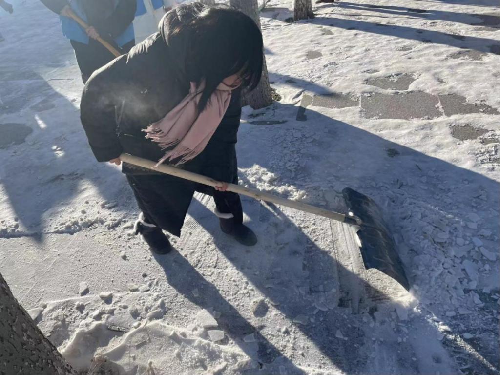 参与本次活动的党员、预备党员和入党积极分子组成“凝心聚力 扫雪护行”志愿服务队,他们不畏严寒,齐心协力挥舞着铁锹、雪铲等除雪工具有条不紊地清理路面积雪、铺设防滑地毯;他们干劲十足,高效配合,经过一个多小时的奋战,已将路面的积雪和坚冰清除干净,消除了教学楼周边的安全隐患,为全校师生开辟出了一条洋溢着暖暖温情的方便之路。