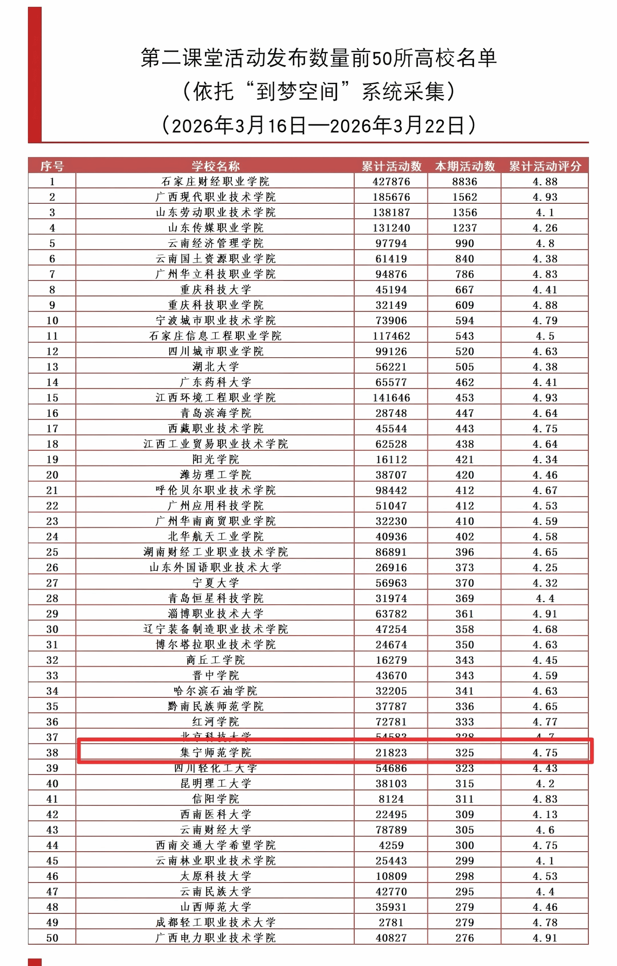 与此同时,“到梦空间”系统运营中心还发布了2026年3月16日-2026年3月22日高校第二课堂大数据周报(第324期),我校凭借扎实的第二课堂活动开展成效,荣登全国第二课堂活动发布数量前50所高校名单,位列第38名,再次彰显我校第二课堂建设的实践成效。
