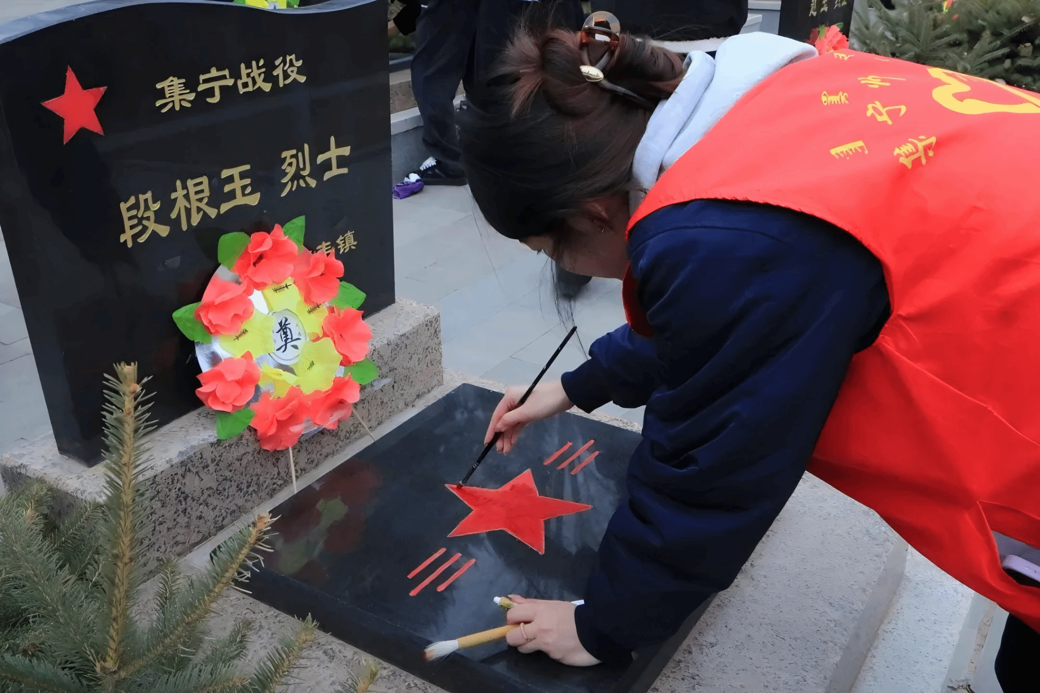 随后,师生们举行了“描红”仪式,大家手持工具,精心描摹碑刻上鲜红的五角星,一笔一画都凝聚着对先烈的无尽追思,在沉浸式的仪式体验中,深刻感悟革命先辈的崇高精神与不屈意志,汲取砥砺前行的奋进力量,让红色基因在指尖传承,在心底深深扎根。