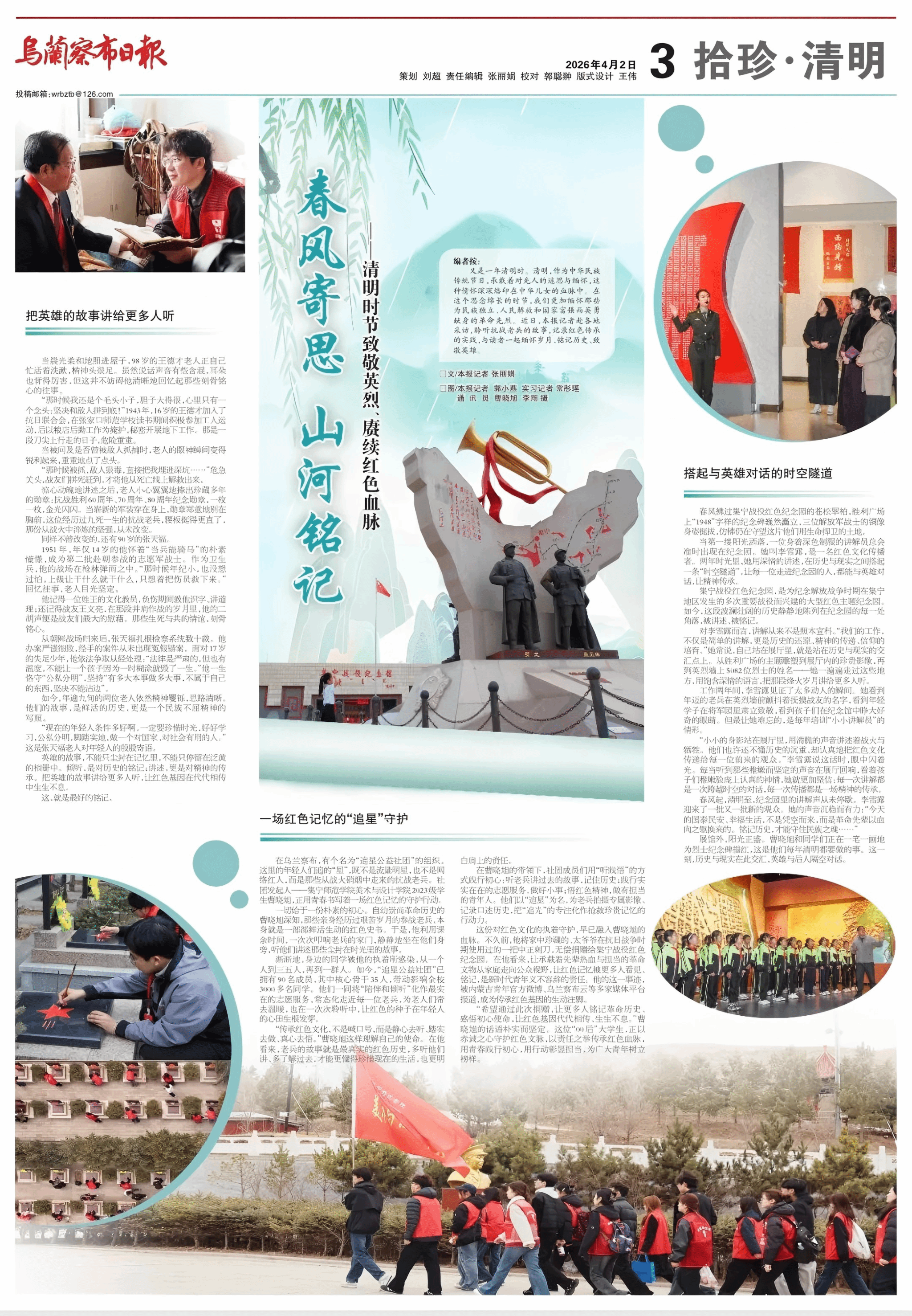 清明节来临之际,我校美术与设计学院团总支、学生会组织、师生代表前往集宁烈士陵园,开展清明祭扫英烈活动,向革命先烈致以最崇高的敬意与最深切的缅怀。此次活动通过线下实地祭扫与沉浸式文化体验相结合的方式,深切缅怀集宁战役革命先烈,传承红色基因,厚植青年学子的爱国主义情怀。活动相关事迹备受瞩目,被内蒙古教育厅、奔腾融媒、内蒙古日报社、内蒙古退役军人事务厅、乌兰察布日报等多家主流媒体集中报道,在社会各界引发强烈反响。