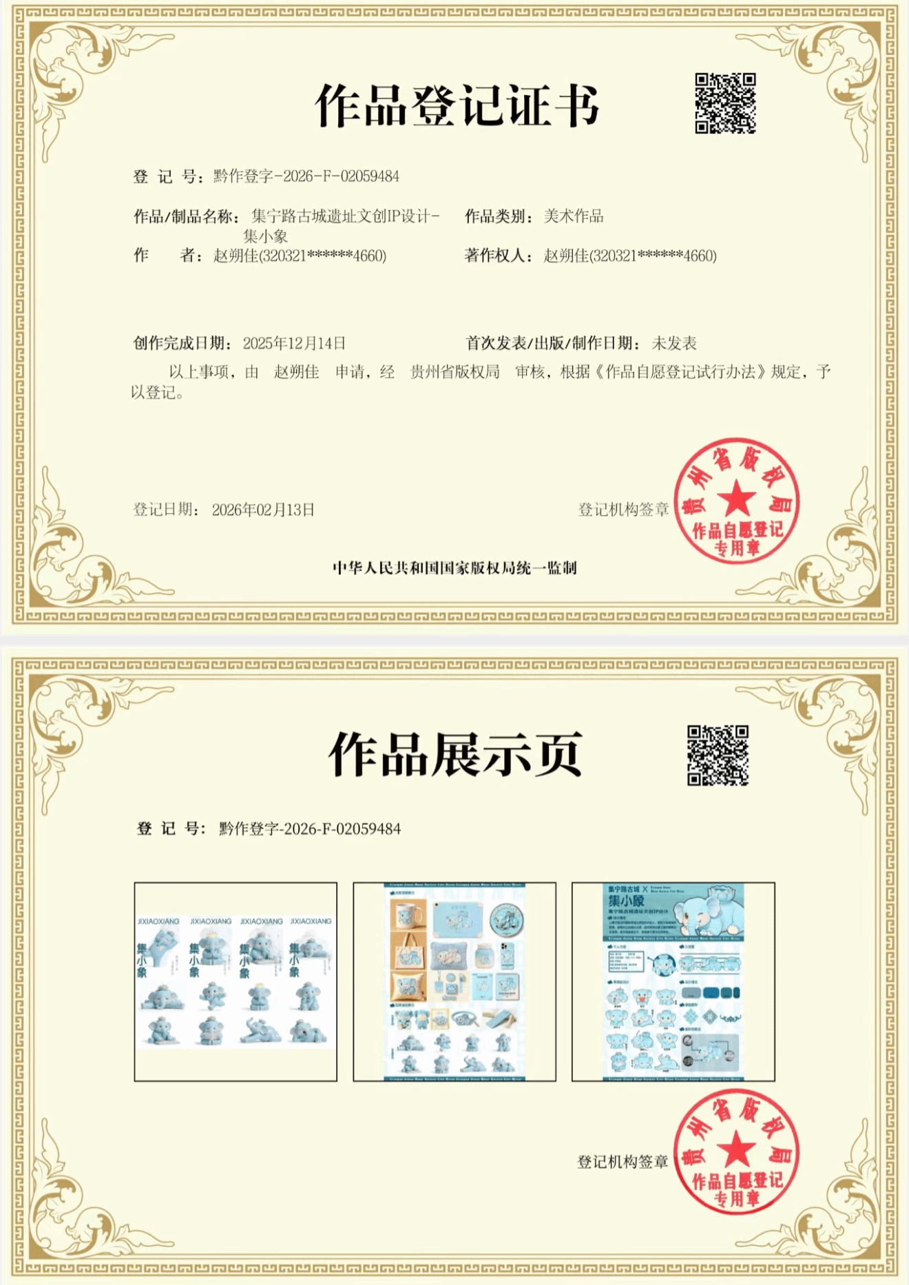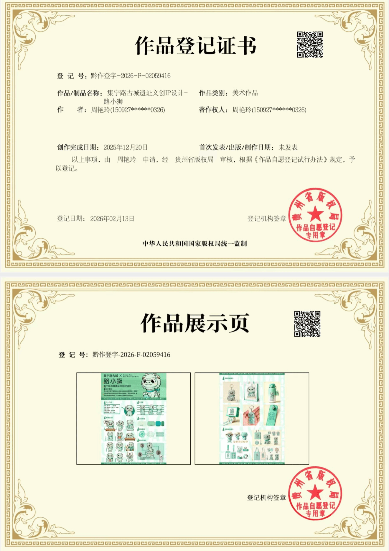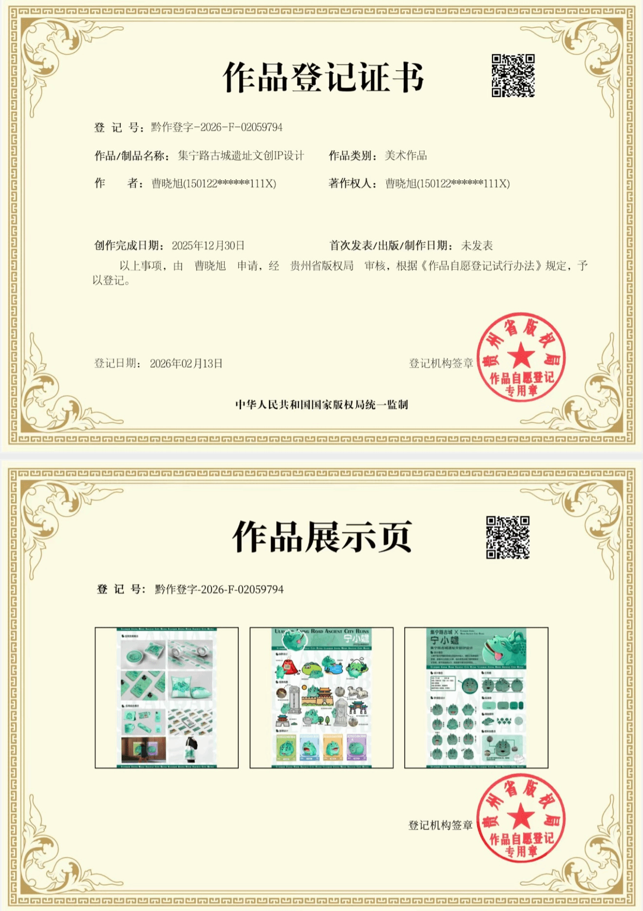 此次入选的作品涵盖课堂教学实践成果、非遗传承原创作品两大类别,兼具艺术创意与地域文化特色。其中,在蔚淑英老师悉心指导的文化产品创意设计课程中,周燕玲、赵朔佳、曹晓旭三位同学创作的《集宁路古城系列IP形象设计》三件版权作品成功入展。该系列作品立足集宁路古城历史文化底蕴,以创意IP设计为载体,深挖地方历史文化内涵,将传统文化与现代设计理念深度融合,实现了历史文化资源的创意转化与版权化呈现。