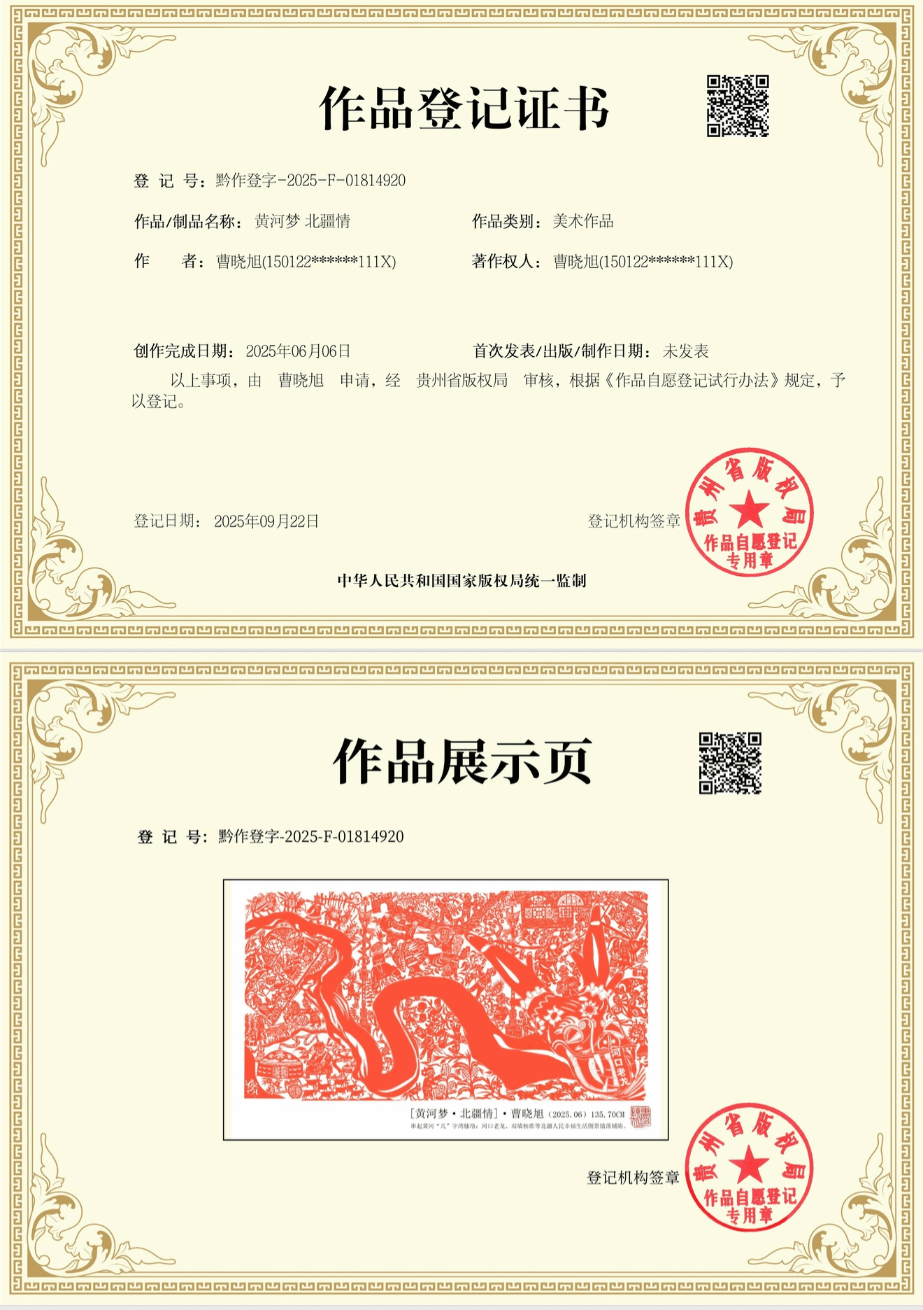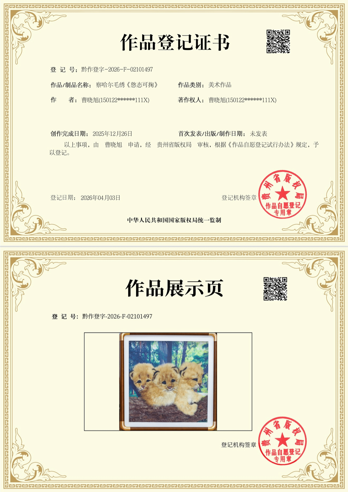 此外,美术与设计学院非物质文化遗产传承与保护研究所选送的曹晓旭两件个人原创版权作品——剪纸《黄河梦北疆情》、察哈尔毛绣《憨态可掬》也顺利入选。两件作品扎根北疆非遗文化沃土,既传承了剪纸、察哈尔毛绣传统技艺精髓,又融入新时代文化表达,充分体现了学校在非遗文化传承、保护与创新发展方面的深耕细作以及对地方优秀传统文化创造性转化、创新性发展的积极探索。