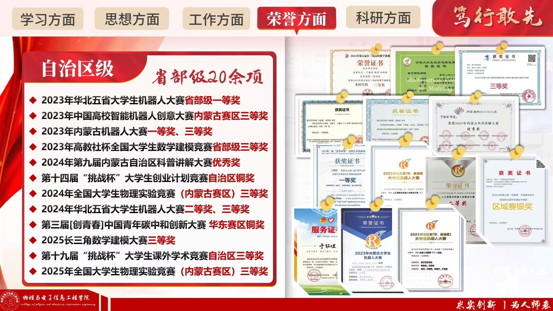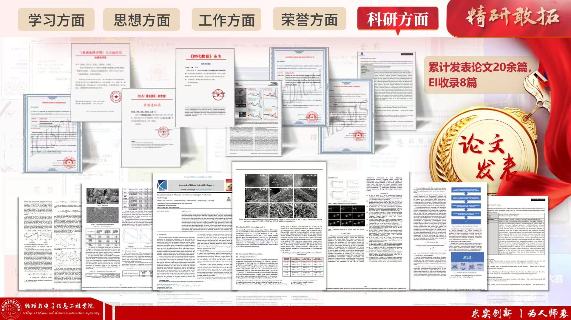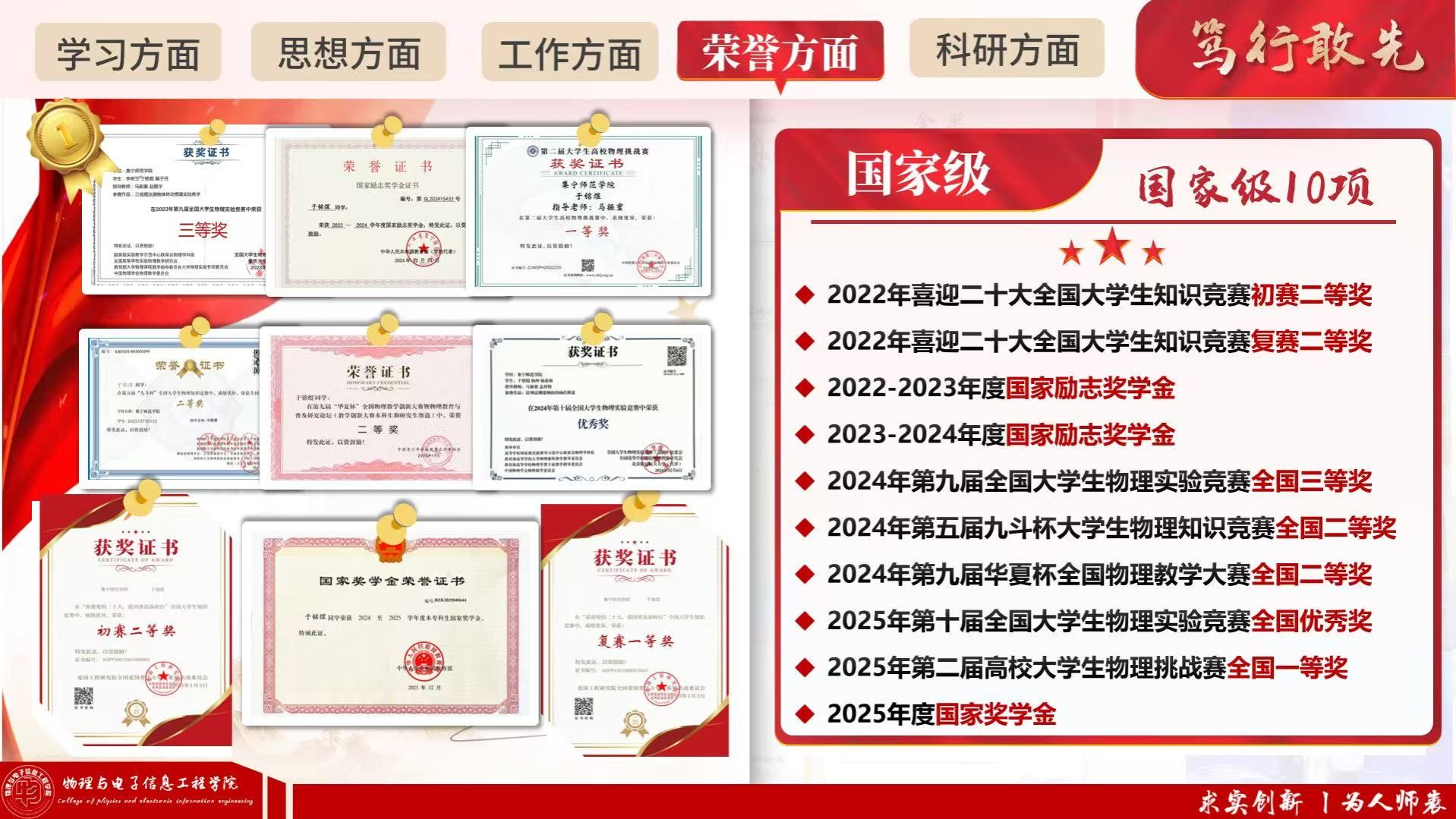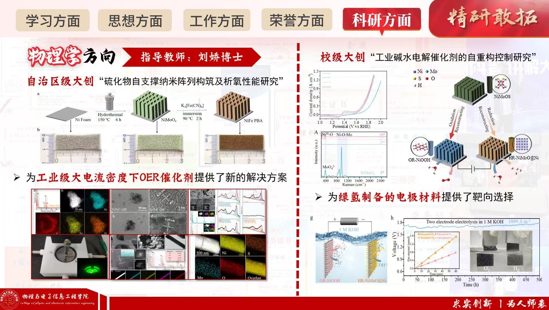 他勤学善思、追求卓越,学业成绩与综合测评连续多年稳居专业第一,平均成绩90.67分,先后荣获国家奖学金、校级“三好学生”“优秀学生干部”“优秀共青团员”等多项荣誉。深耕学术与科创赛场,在全国大学生物理实验竞赛、国家级师范教学技能大赛、省部级机器人大赛、数学建模大赛、科普讲解大赛等高水平赛事中屡获佳绩,累计斩获各级各类奖项100余项,其中国家级10项、省部级20余项。潜心科研、勇攀高峰,发表学术论文20余篇(含EI检索8篇),主持及参与自治区、校级大学生创新创业项目4项,聚焦电解水制氢等前沿课题开展研究,以扎实学识与创新能力展现了新时代青年学子的奋进姿态。