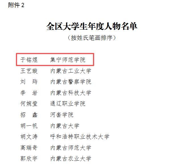 近日,自治区教育厅公布2026年全区大学生年度人物推选展示活动暨择优推荐教育部“最美大学生”择优推荐结果。我校物理与电子信息工程学院于铭煜同学成功入选,获评2026 年 “全区大学生年度人物”,成为全区 10 名获此殊荣的优秀大学生之一。此项荣誉既是对我校学子综合素质、精神风貌与榜样力量的充分肯定,更是学校长期坚守立德树人根本任务、持续提升人才培养质量的生动彰显。