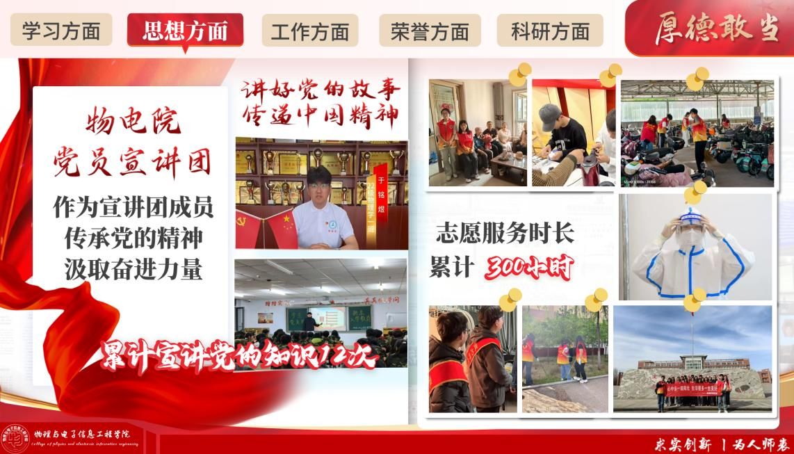 他信念坚定、担当有为,始终以党员标准严格要求自己,积极践行社会责任。累计参与志愿服务时长超300小时,作为学院党员宣讲团成员开展理论宣讲12次,参与支部活动 408次、党务工作超600场,将专业所学融入科普育人与社会实践,用实际行动诠释了青年党员的初心使命与责任担当。