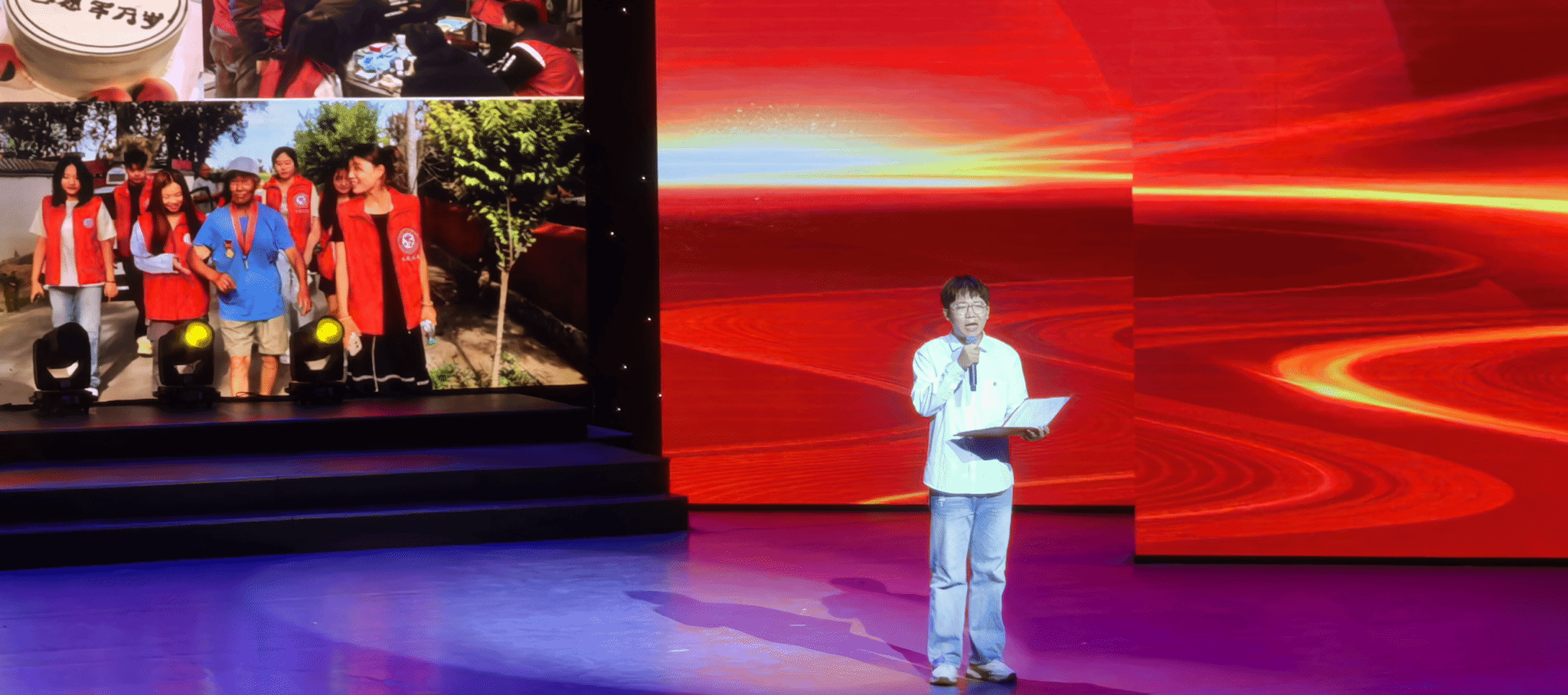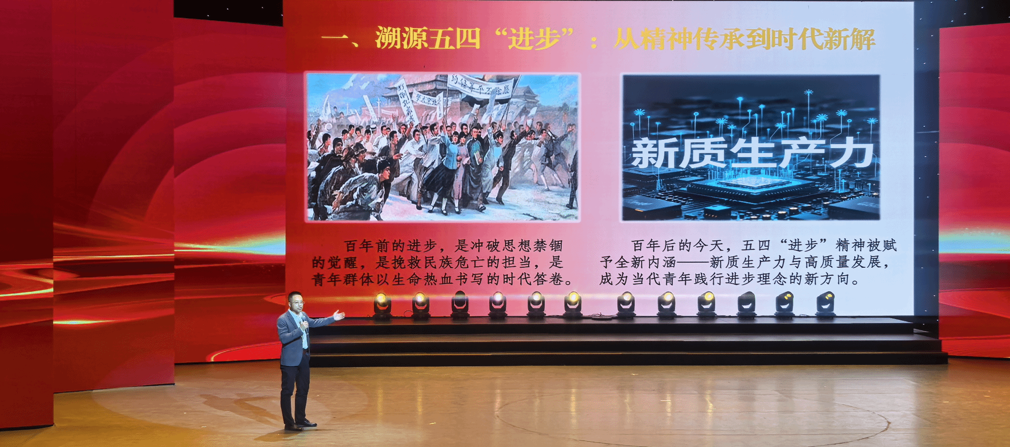 活动现场,我校师生深度参与多个环节,贡献了兼具思想性与感染力的精彩呈现。在【第一篇章·脚下的土地】理论导引中,我校教师郝青山以扎实的理论功底,带领现场青年重温五四精神的时代内涵,引导大家深刻感悟新时代青年的责任与担当。
