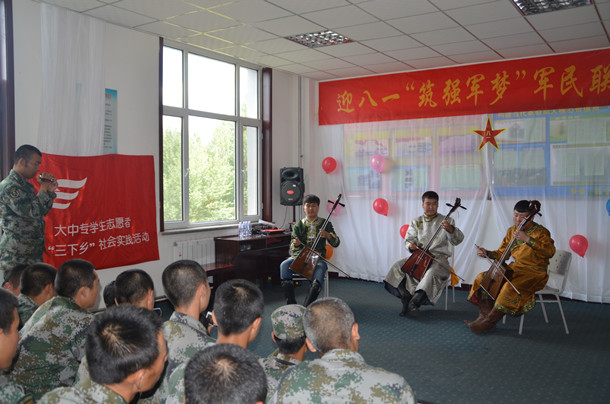 同学们怀着对军人的无比崇敬之情,用精心准备的军旅歌曲、马头琴表演、舞蹈等为部队官兵送去了节日的祝福。战士们也以自己的部队生活为题材,表演了双簧、相声、小合唱等节目,显示了他们在庄严外表下的幽默与时尚。