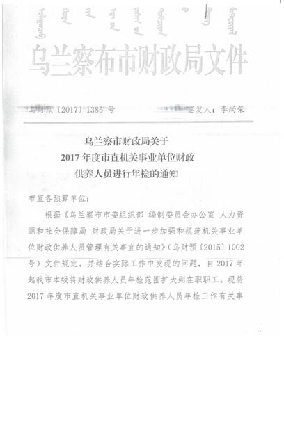 附件:乌兰察布市财政局关于2017年度市直机关事业财政供养人员进行年检的通知