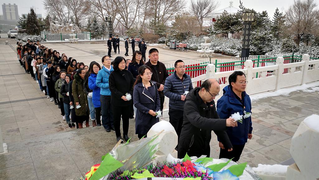 全体师生在烈士纪念碑前深深三鞠躬,表达对革命烈士的深切缅怀和无限敬仰,并列队依次向革命烈士敬献鲜花,寄托哀思。