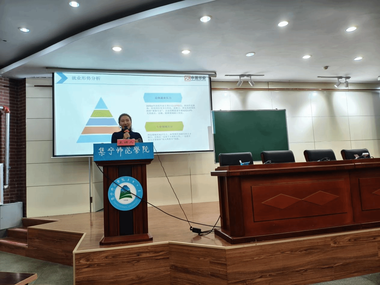 为深入解析人工智能时代的前沿趋势与就业前景,帮助学生把握技术动向、明确核心领域岗位需求、对接校企实训资源,从而科学规划学业、提升就业竞争力,2025年11月20日,计算机与大数据学院、信息安全现代产业学院联合北京中晟华安信息技术有限公司,在泉山校区图书馆报告厅举办了《人工智能时代下学习与就业趋势分析及展望》专题讲座。中晟华安公司兰助晴总经理、就业部姚鑫楠经理,学院领导班子全体成员、软件工程专业各班主任、2023级、2024级、2025级软件工程专业学生共同参与了此次讲座。