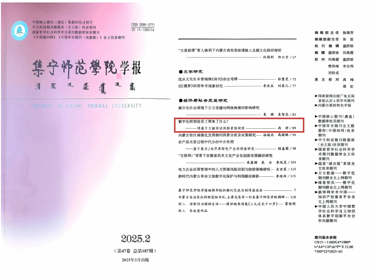 发表于《集宁师范学院学报》(2025年第2期)的文章《数字化转型给员工带来了什么?——一项基于文献综述的探索性研究》被人大复印报刊资料《管理学文摘》(2025年第4期)全文转载,文章作者为集宁师范学院经济与管理学院副教授、科技处副处长尚妤博士。