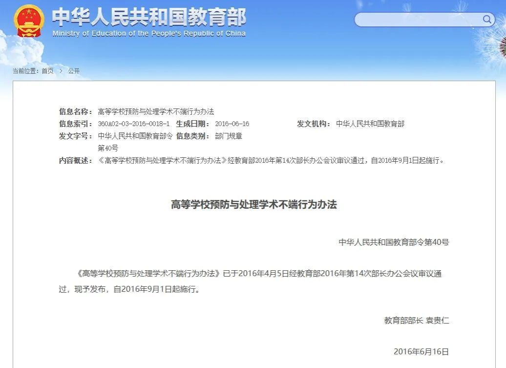 中华人民共和国教育部自2016年9月1日起实施《高等学校预防与处理学术不端行为办法》,本办法所称学术不端行为是指高等学校及其教学科研人员、管理人员和学生,在科学研究及相关活动中发生的违反公认的学术准则、违背学术诚信的行为。