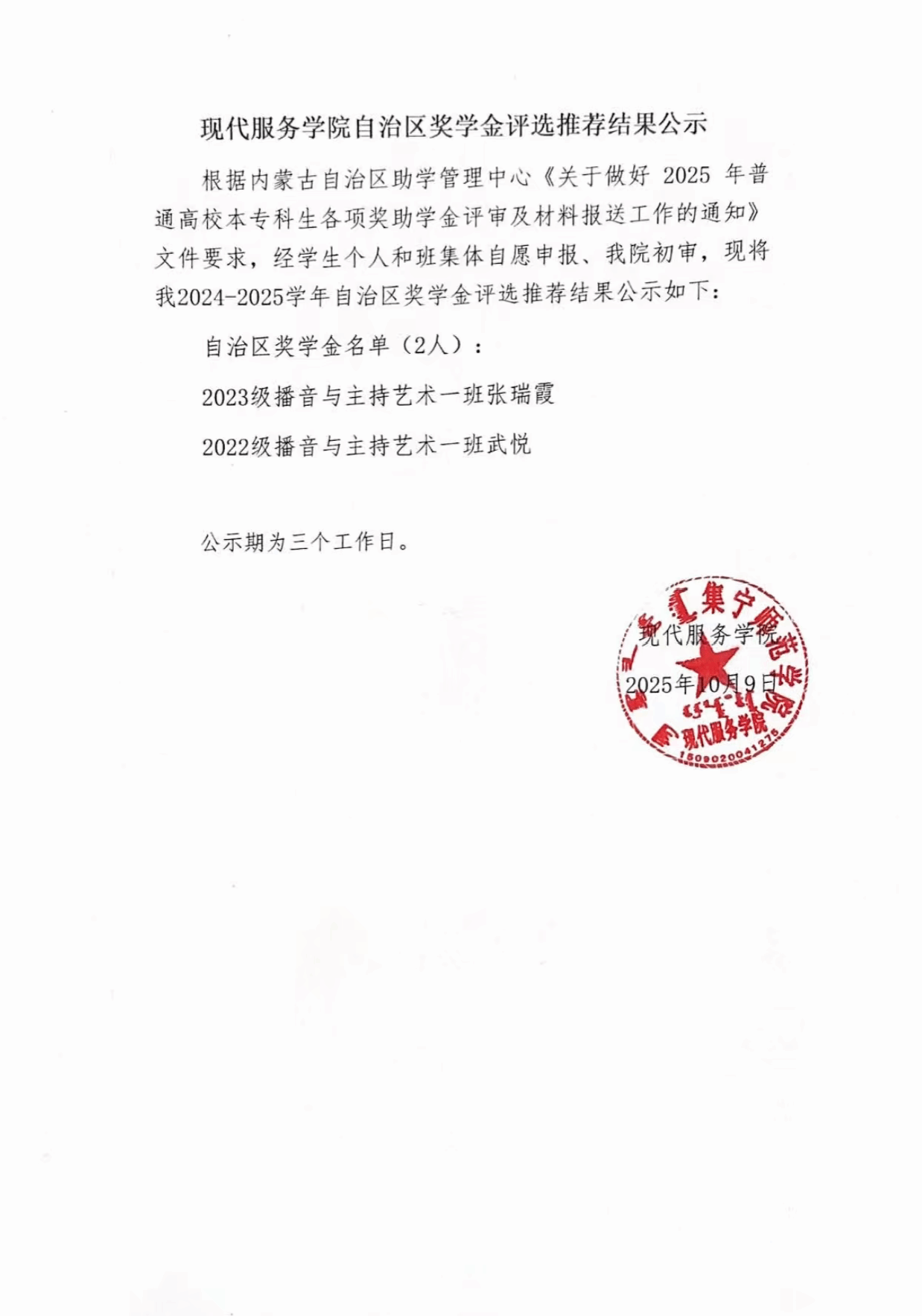 现代服务学院自治区奖学金评选推荐结果公示
