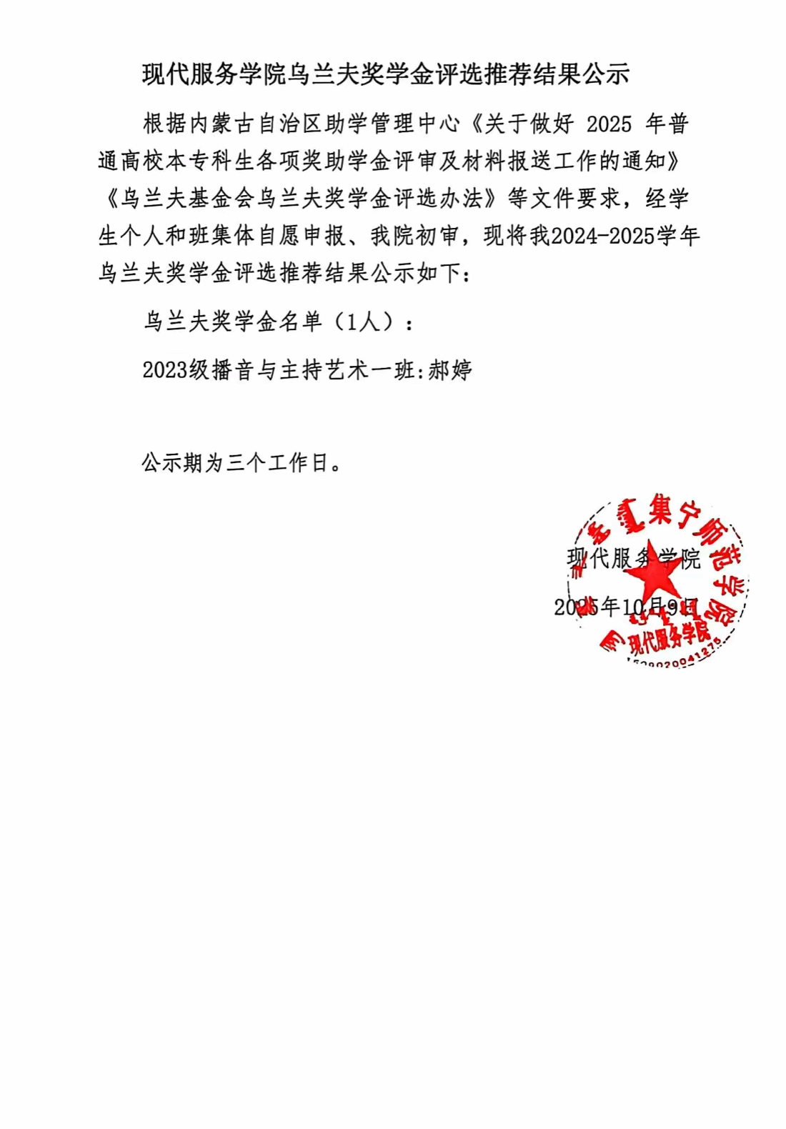 现代服务学院2024-2025学年乌兰夫奖金评选推荐结果公示