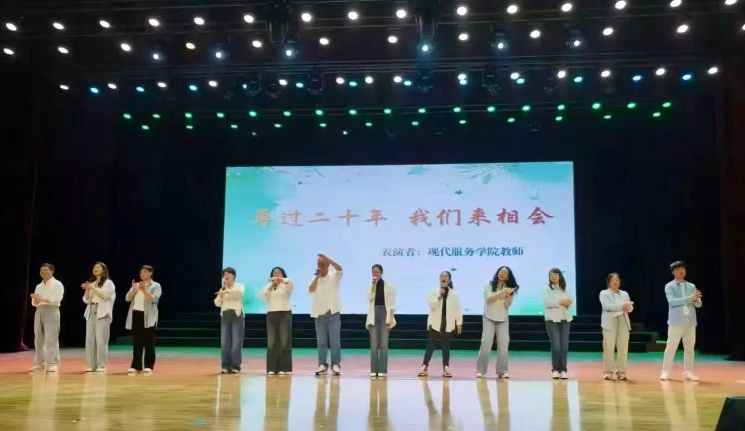演出中的动人高潮,来自于一份精心准备的温情惊喜——现代服务学院领导班子及播音教研室的教师们登台献唱《二十年后再相会》。深情的歌声不仅传递着对毕业生的真挚祝福与不舍牵挂,更寄托了一份跨越时间的师生约定,将现场氛围推向温暖的高潮。