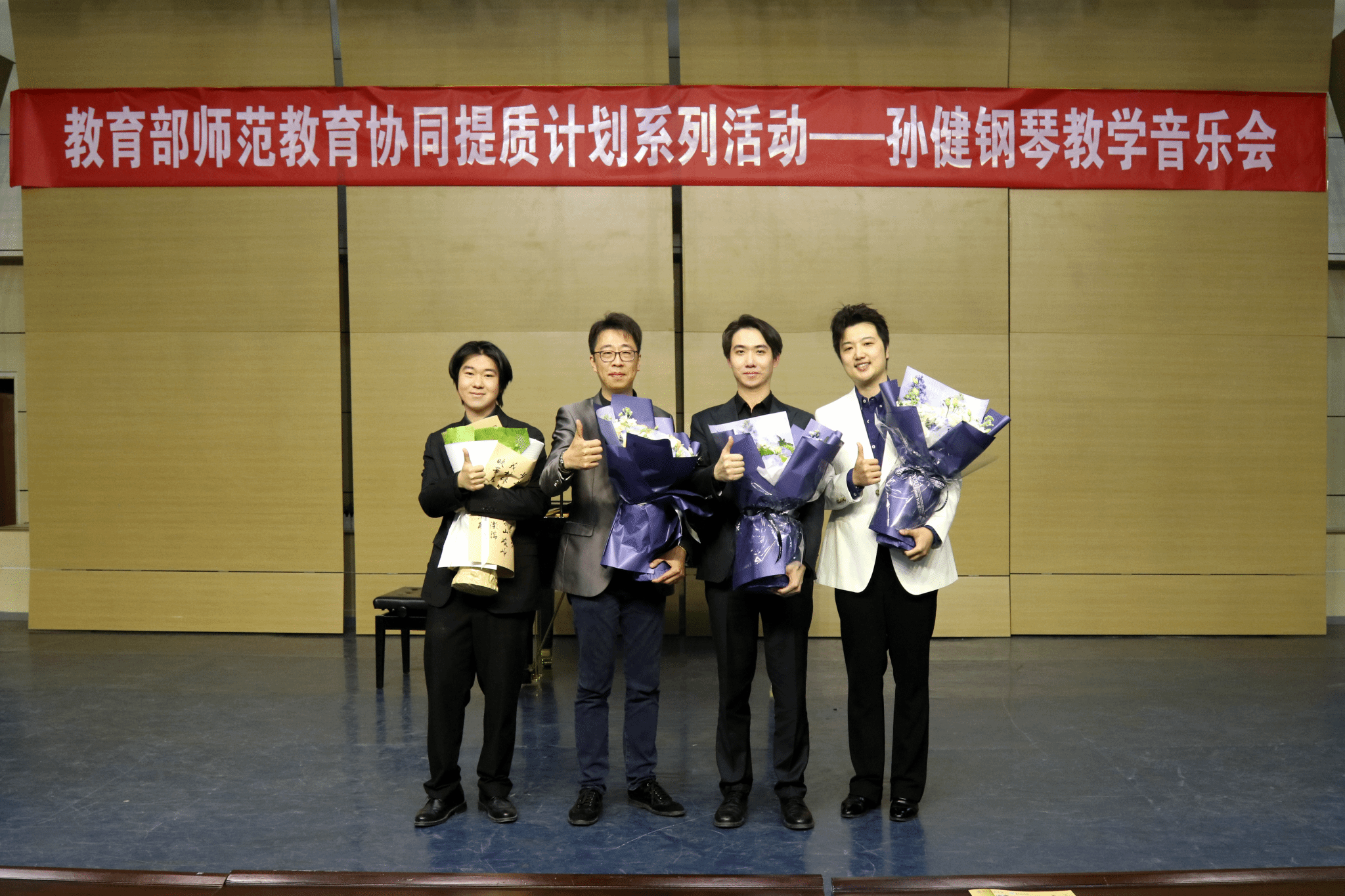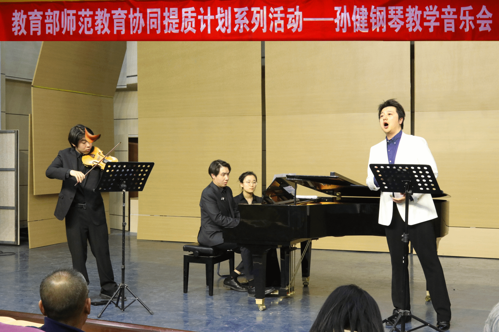 孙健教授结合教学实践,系统讲解了钢琴演奏中的技术难点与艺术表达要点,为师生带来了一堂兼具专业性与启发性的公开讲座。随后的教学音乐会中,孙健老师的学生吴泽与中央音乐学院小提琴研究生王梓轩、声歌系博士生王实,以多元形式联袂呈现了一场高水平艺术盛宴。演出涵盖了肖邦《练习曲 Op.10 No.4》、李斯特《狩猎》、贝多芬《奏鸣曲 Op.31 No.3》第一乐章以及巴赫《平均律钢琴曲集 BWV 861》;从勃拉姆斯《间奏曲 Op.118 No.2》的深沉内敛、《匈牙利舞曲第五号》的热烈奔放、瓦格纳《浪漫曲》的柔美歌唱、皮亚佐拉《1960夜总会》的探戈律动,到中国传统民歌《敕勒歌》的民族意境,整场音乐会融高难度独奏、三重奏、伴奏于一体,跨界碰撞出丰富的艺术火花。