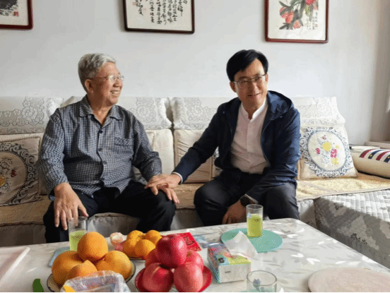 校领导与退休老教师亲切交谈,衷心感谢他们为教育事业做出的贡献,亲切问候他们的身体健康和家庭生活情况,并向他们介绍了学校近期的发展情况和未来规划,征求了有利于学校发展的宝贵意见。退休老教师们感谢学校的关心和慰问,表示虽已离开工作岗位,但一直关注、关心着学校的建设和发展,今后将持续发光发热,争取老有所为。