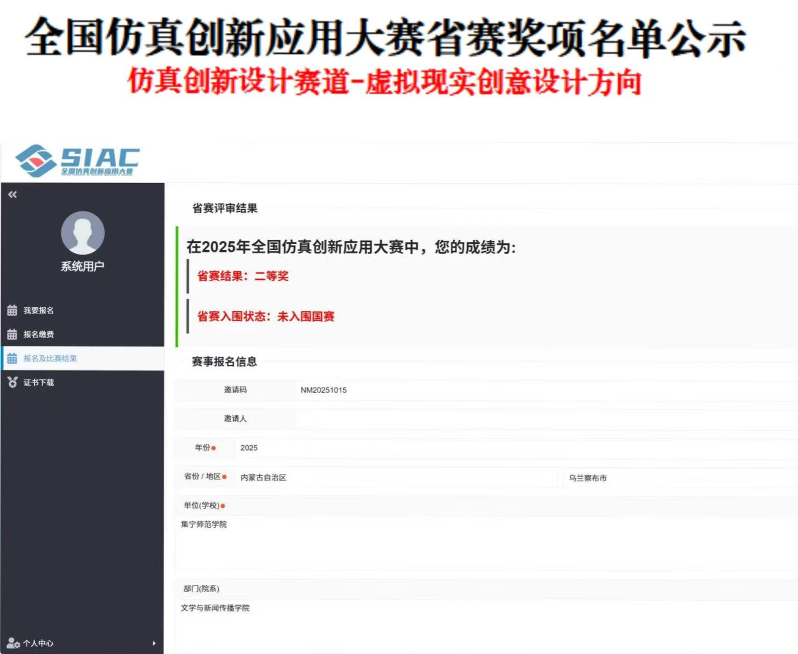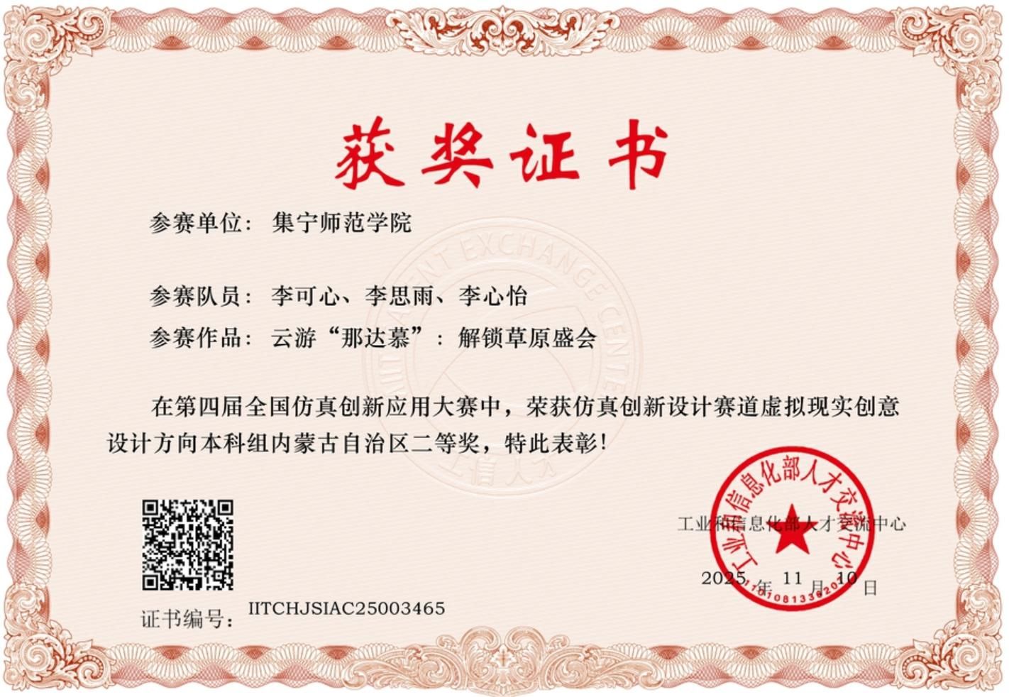近日,2025年全国仿真创新应用大赛省级评审工作圆满落幕。我校文学与新闻传播学院由靳舍老师指导,李可心、李思雨、李心怡三位同学组成的参赛团队,凭借作品《云游“那达慕”:解锁草原盛会》在“仿真创新设计赛道-虚拟现实创意设计方向(本科组)”的比拼中表现亮眼,以突出的创意性与实践价值,成功斩获省赛二等奖。