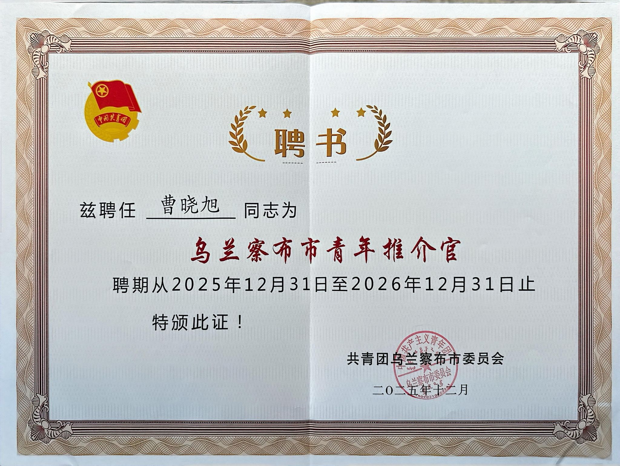 12月30日,由共青团乌兰察布市委员会、乌兰察布市文化旅游体育局、乌兰察布青年联合会主办,以“青春挺膺担当 我为家乡代言”为主题的乌兰察布市“青年推介官”聘任仪式暨青联思享汇主题活动在乌兰察布市举办。我校美术与设计学院学生曹晓旭凭借在地域文化传承、红色志愿服务中的亮眼表现,成功获聘乌兰察布市“青年推介官”,并作为青年代表在活动现场作主题发言。校团委副书记范娟受邀出席活动。