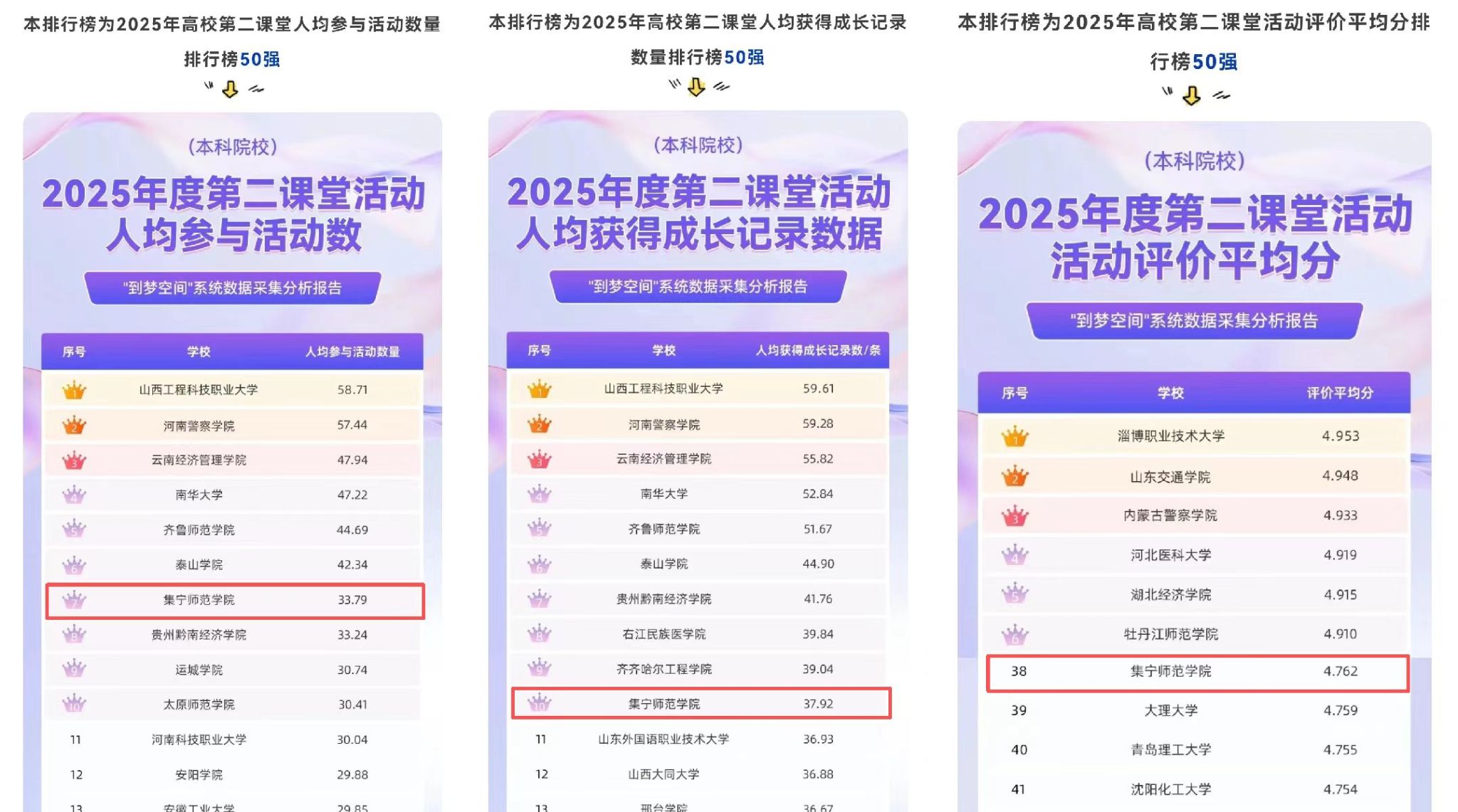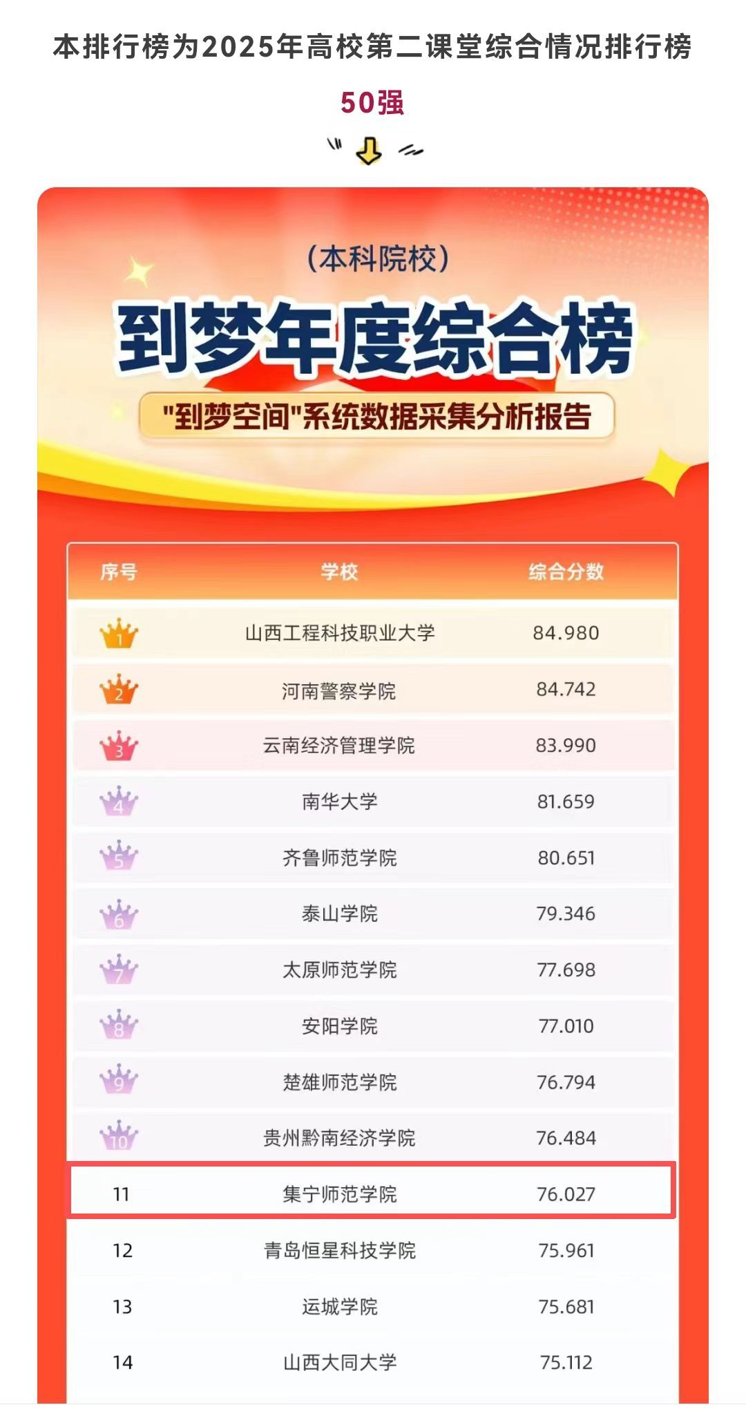 近日,在团中央学校部、全国学校共青团研究中心指导,“到梦空间”系统运营中心发布的“第二课堂成绩单”工作2025年度榜单中,我校成功入围高校第二课堂活动综合榜单、人均参与活动数量榜单、人均获得成长记录数据榜单和活动评价平均分榜单四个排行榜(以上每个榜单只收录前50名本科院校),分别位列全国本科院校第11名、第7名、第10名和第5名。