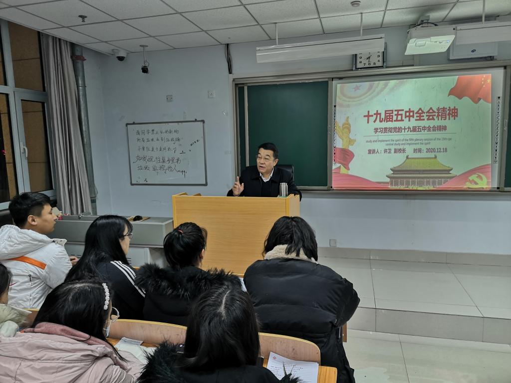 12月18日晚上,集宁师范学院党委委员、副校长许卫根据学校党委关于党政干部为联系班级宣讲党的十九届五中全会精神有关工作要求,深入生命科学学院、化学与化工学院,为联系班级宣讲党的十九届五中全会精神。