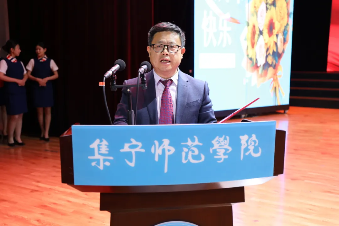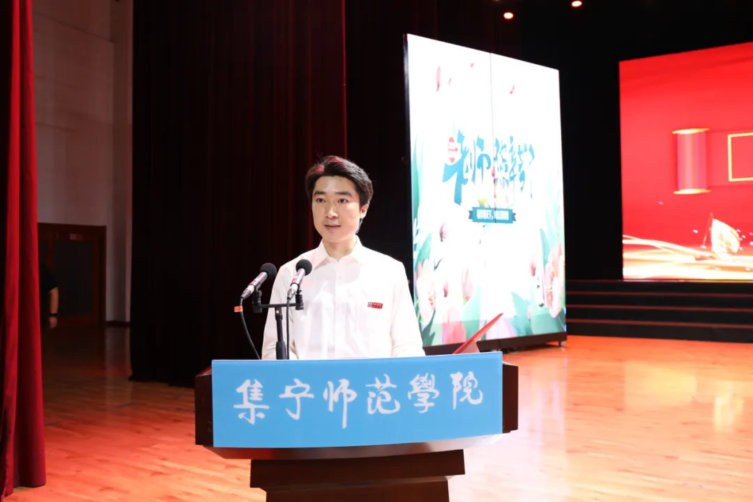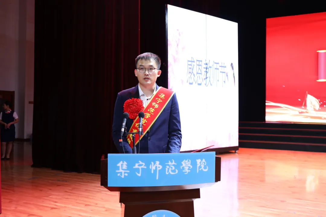 优秀教师代表王腾发言。他表示会继续坚守教育初心,以更高的标准要求自己,把这份荣誉化作前行的动力,在集宁师范学院这片沃土上深耕细作、默默奉献,用一届又一届学生的成长与进步,诠释“师者”的责任与担当,让教书育人的初心在岁月沉淀中愈发坚定闪亮。