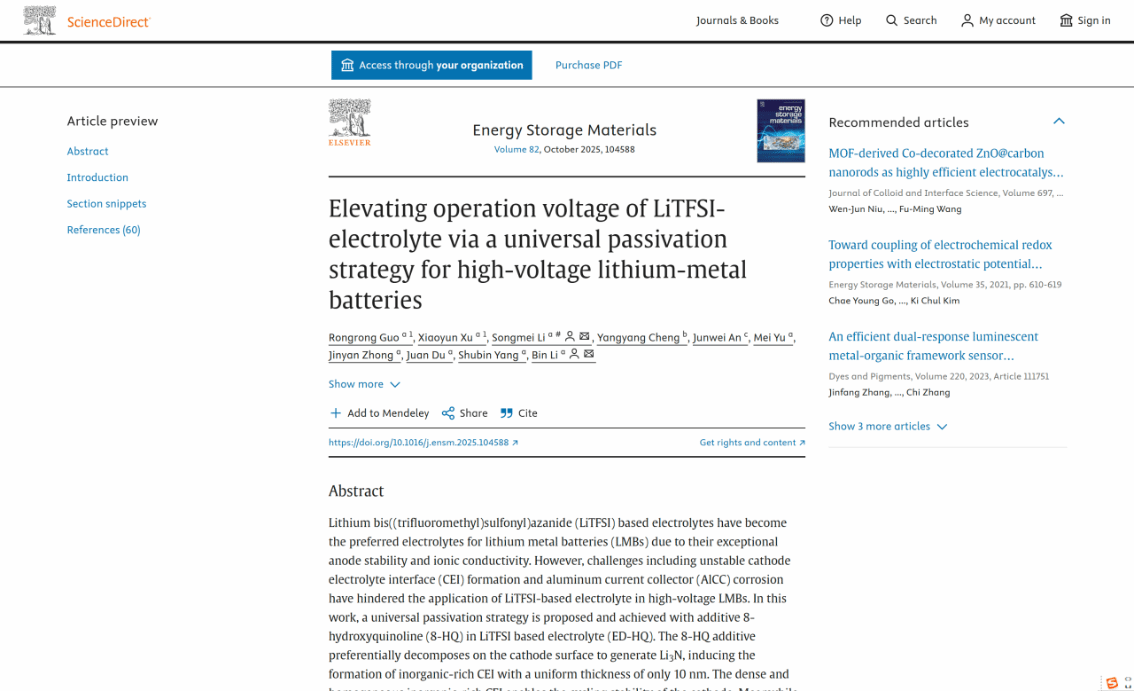 此项成果以"Elevating operation voltage of LiTFSI-electrolyte via a universal passivation strategy for high-voltage lithium-metal batteries"(论文链接:https://doi.org/10.1016/j.ensm.2025.104588)为题发表在国际新能源、新材料TOP期刊《Energy Storage Materials》上,该学术期刊为中国科学院2025年期刊分区材料科学大类学科Q1区TOP国际期刊 ,最新影响因子为20.2。这是石墨烯研究院新能源研究团队2025年发表的第3篇一区SCI论文。