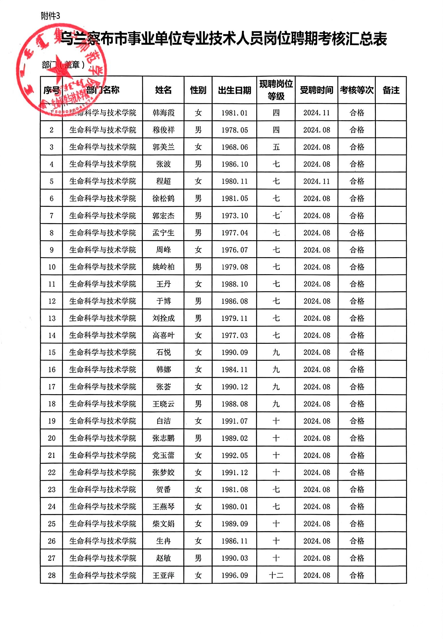 根据学校人事处发布的《关于开展2024—2025年度聘期考核的通知》通知和工作安排,生命科学与技术学院成立聘期考核领导小组,按照《集宁师范学院关于专业技术人员岗位聘期考核工作实施方案》和《生命科学与技术学院关于专业技术人员岗位聘期考核工作细则》,对学院专业技术人员进行了考核,考核结果公示如下: