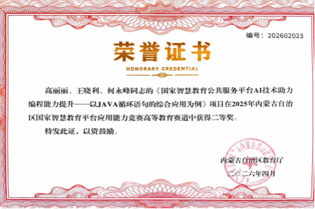在2026年1月5日举办的第一届内蒙古自治区国家智慧教育平台应用能力决赛中,由我院高丽丽、王晓利、何永峰组成的教师团队在比赛中表现优异,凭借扎实的专业功底、创新的应用能力和出色的团队协作,荣获高等教育赛道二等奖。