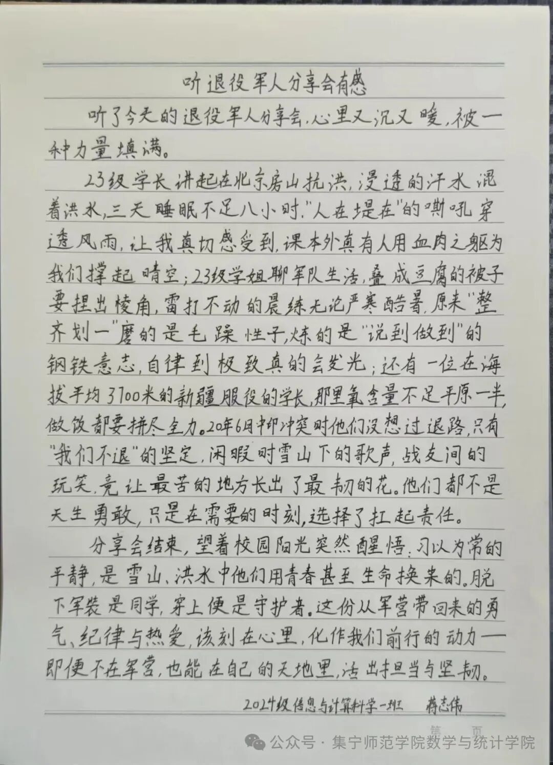 2023级数学与应用数学一班刘梦雪则以部队记录和战友情谊为切入点,她感慨,卫国戍边不是一句口号,而是摔进坑里再爬起的倔强,是和战友们朝着“守护每一寸土地”的目标奔跑的滚烫,那些日子早已刻进骨子里,成为永不褪色的信仰。