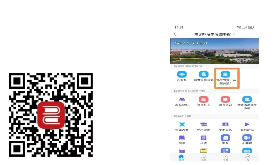 1.手机下载安装“超星移动图书馆”APP或学习通进入集宁师范学院图书馆首页(邀请码:nmjnsf)
