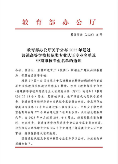近日,教育部办公厅正式公布了2025年通过普通高等学校师范类专业认证的专业名单,我院物理学专业顺利通过国家师范类专业第二级认证,认证结论有效期为六年(2025年9月至2031年8月)。这是我院师范专业建设取得的又一重大突破!