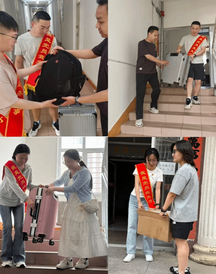 支部组织了“温情搬行李”志愿服务活动。他们化身 “暖心助手”,帮助毕业生们搬运行李、传递重物,用点滴行动减轻大家负担。无论是沉重的行李箱,还是装满资料的纸箱,党员们都热情接力,让服务的温度在传递中升温。这一系列举动展现了党员的责任与担当。