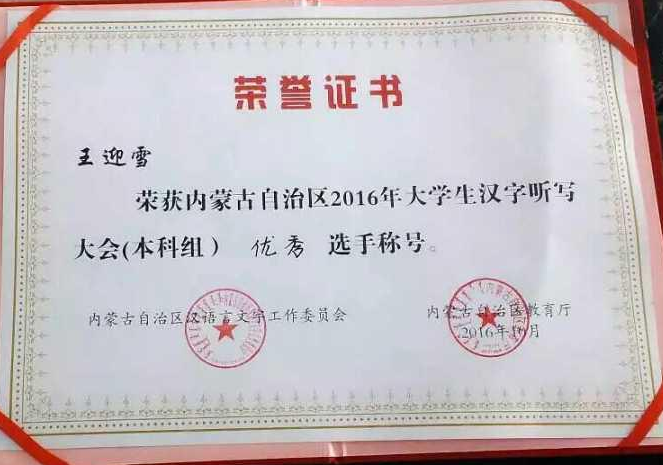 近几年的汉字听写大会中,我院连续三年承办我校汉字听写大会,积极参加并多次取得优异成绩。2016年,在集宁师范学院首届“中国汉字听写”大赛决赛中,文学院代表队荣获季军称号,李丽娜同学荣获个人赛桂冠;2016年内蒙古自治区首届大学生汉字听写大会本科组比赛中,我校荣获亚军;我院团总支书记张炜老师被评为优秀指导教师;王迎雪同学荣获优秀选手称号;蔡宇同学荣获亚军选手称号;焦靖轩同学荣获亚军选手称号;2016年全区汉字听写大赛中,我院团总支书记张炜老师被评为优秀指导教师;2017年内蒙古自治区第五届汉字听写大会(大学生本科组)中,学生代表获得优异成绩,我院团总支书记张炜老师荣获优秀队选手优秀辅导教师称号;2018年集宁师范学院文学院第一届“汉字听写”大赛中,吴纪委荣获一等奖,杜文慧荣获二等奖,张冰宇荣获三等奖,郭英和苗苗荣获优秀奖;2020年,由集宁师范学院汉语言文字工作委员会主办,集宁师范学院普通话培训测试工作站承办的集宁师范学院第三届汉字听写大会中,我院荣获二等奖。