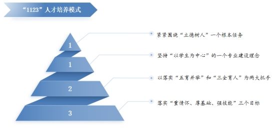 学院秉承传统、守正创新,强化专业内涵建设,着力打造“1123”人才培养模式,即:紧紧围绕“立德树人”一个根本任务;坚持“以学生为中心”的专业建设理念,以落实“五育并举”和“三全育人”为两大抓手;落实“重情怀、厚基础、强技能”三个目标,全面促进教育教学水平和人才培养质量提升。