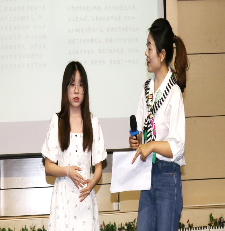 活动邀请师从我国著名声乐教育家金铁霖先生,曾获得第七届内蒙古自治区室内乐大赛民族声乐组一等奖,现就职于内蒙古艺术学院姚瑶副教授为师生授课。公开课上,姚瑶老师结合自身教学,讲述了中国民族声乐表演理论的形成发展。在课堂教学示范环节中,指导学生演唱了《丢戒指》《放风筝》《催咚催》等东北、河北、湖北各地民歌,展示了声乐演唱技术的独到见解。