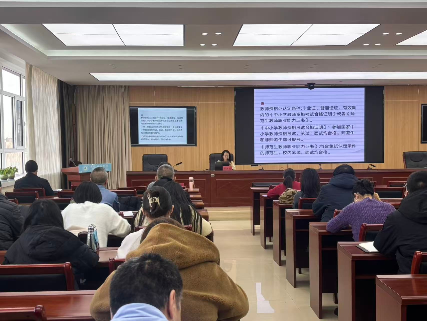 随后,讲座进入我校免试认定教师资格认定工作介绍环节。招生办公室主任蔡国瑛对政策的适用范围、申请条件、认定流程及注意事项进行了清晰解读。此项政策是拓宽毕业生就业渠道的重要举措,为有意投身教育事业的优秀学子提供了便捷通道,引起了在场师生的广泛关注。